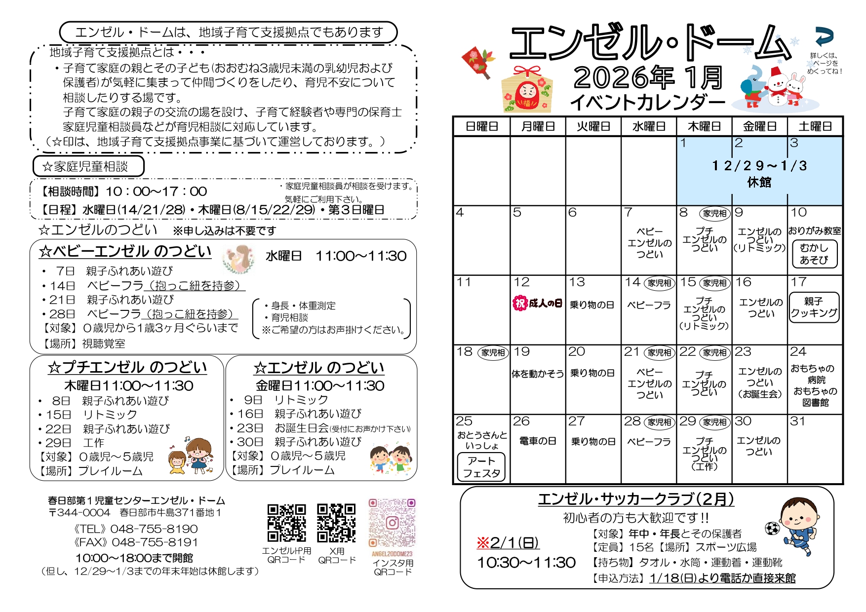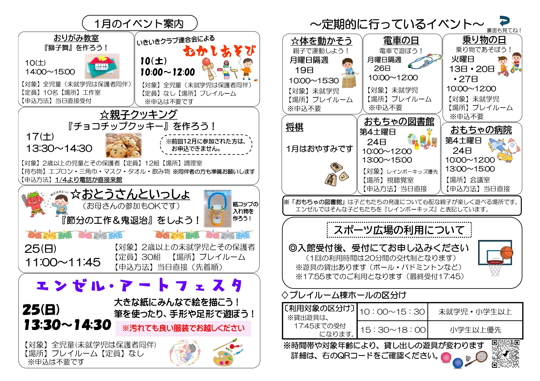 ※ランチルームをご利用できます。詳細は、 こちら をご覧ください。 ※中学生以上が利用できる「自習室」を開放しております。詳しくは、こちらをご覧ください。 ※イベントは、都合により変更・延期・中止となることもあります。予めご了承ください。 1月 イベント情報 12月 イベント情報
