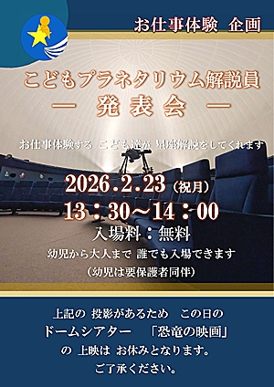 | 木・金曜日 | 15:00~ | 季節の星座解説+「470億光年の、その先へ」 |